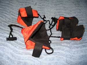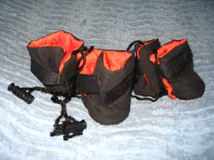 Для лучшего крепления соединяем обувь через спину попарно резинкой или эластичным шнуром. Для регулировки длинны шнура, поставьте пластиковый фиксатор.